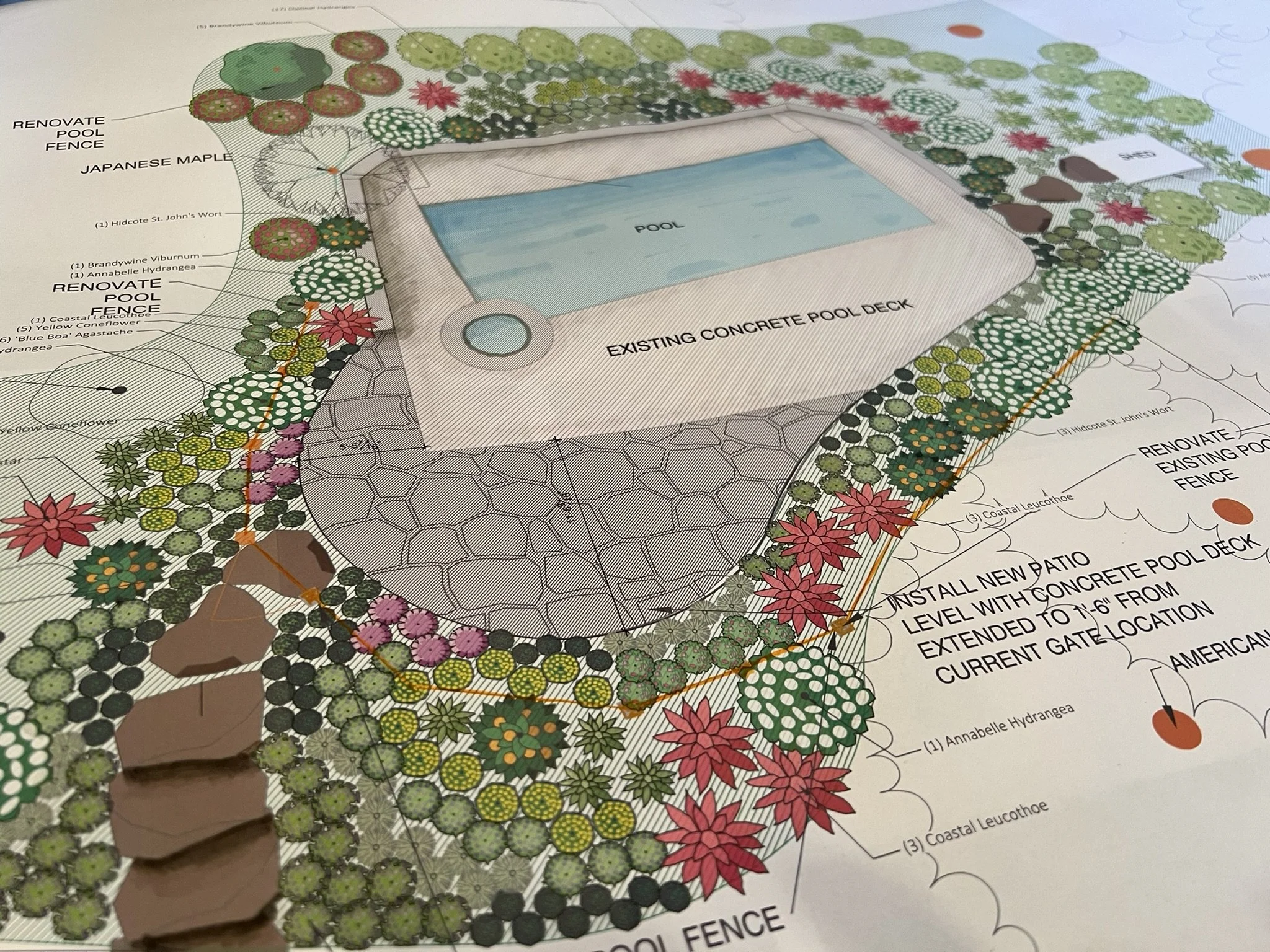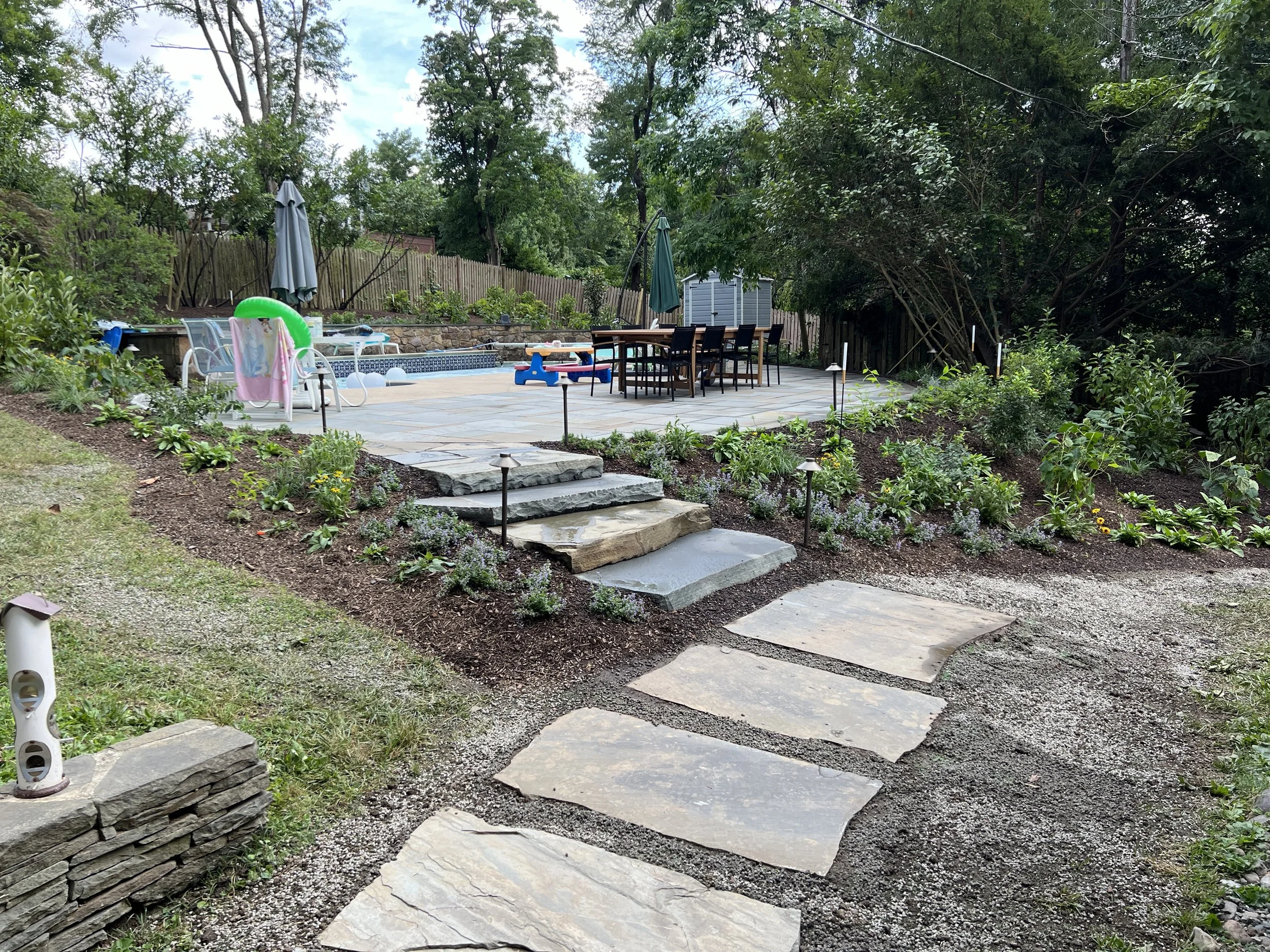 THIS SHORTRIDGE POOL WAS REIMAGINED WITH FLOWERING SHRUBS, PERENNIALS, GRASSES AND LIGHTING TO BRING NEW ENERGY TO THIS ENTERTAINING SPACE